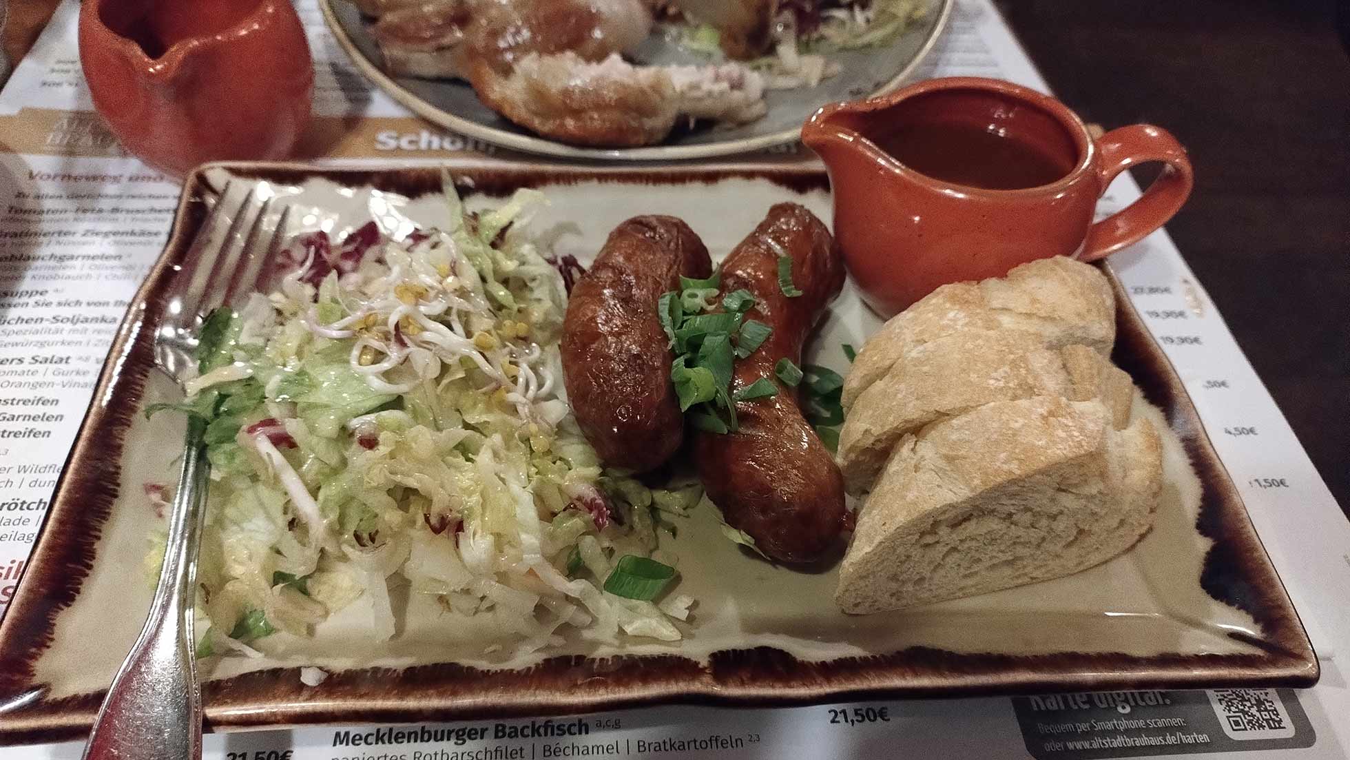 De volta à cidade, eu tinha um objetivo claro: comer Eisbein na Alemanha. Descobrimos que havia apenas um restaurante em Schwerin que servia um Eisbein parecido com o que conhecemos aqui como Eisbein à pururca, mas era necessário fazer reserva. Fizemos a reserva e ficamos fazendo hora no shopping até chegar o horário.