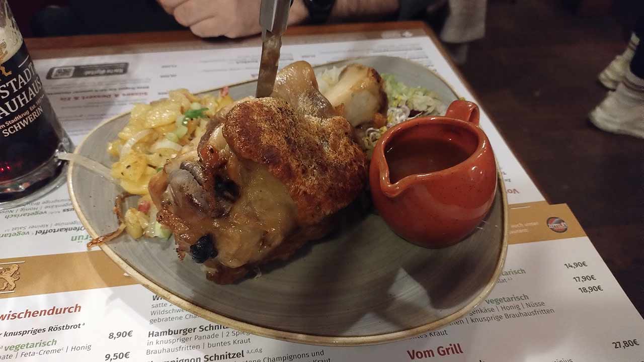 O restaurante escolhido foi o Altstadt Brauhaus Schwerin, fundado em 1937. Dividimos um Eisbein, que era bem menor do que os que estamos acostumados a ver no Brasil, já que lá é considerado um prato individual. O nome do prato é Ofenfrische Schweinshaxe